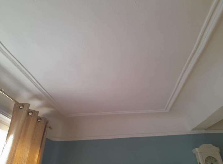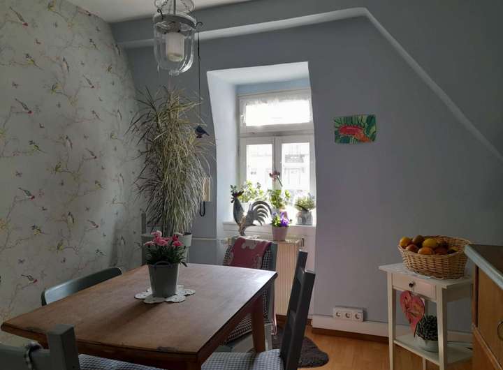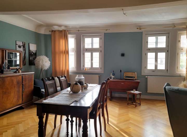 1. Obergeschoss: Großes Wohnzimmer mit originaler Stuckdecke, Gäste-WC, moderne Küche (BJ 2020), stilvolles Tageslichtbad (komplett saniert 2020, inkl. Leitungen), Esszimmer und Vorratsraum
