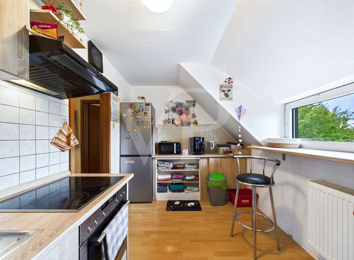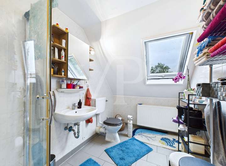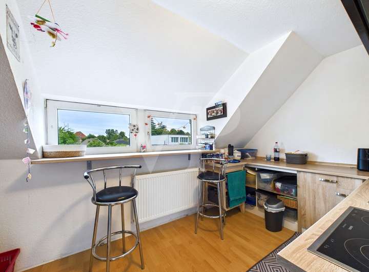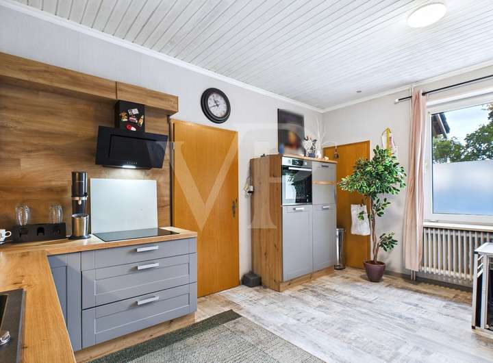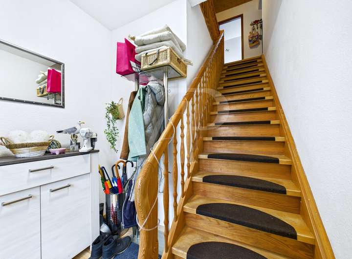 Das Obergeschoss erreichen Sie über einen eigenen Eingangsbereich mit Treppe. Hier gibt es ebenfalls helle Räume, Laminat, eine zweite Küche und ein weiteres Bad. Beide Einheiten lassen sich unabhängig voneinander nutzen – perfekt für flexible Wohnkonzepte.