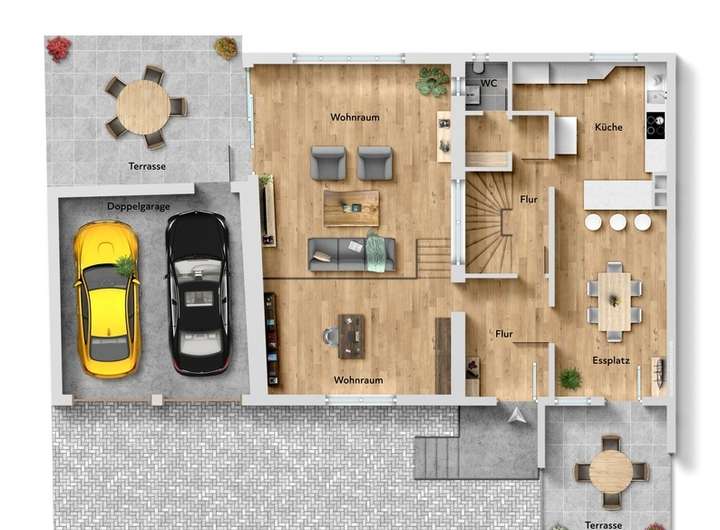 Komplettiert wird das Angebot durch eine Doppelgarage mit zwei davor befindlichen Stellplätzen.