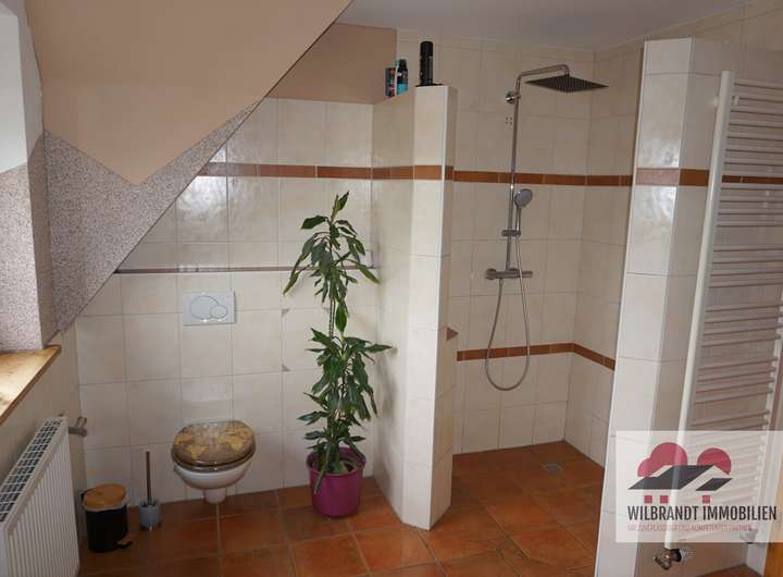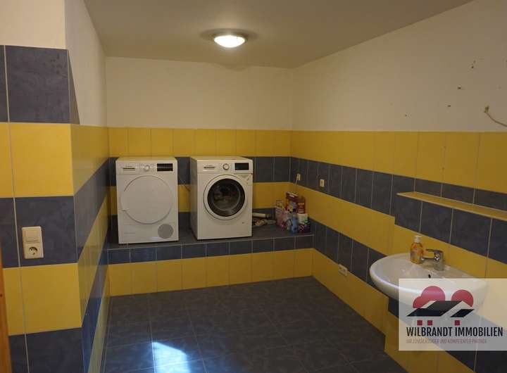 Weitere Nutzfläche ist im Untergeschoss, das über die Wohndiele im Erdgeschoss und eine Treppe zum Grundstück erreichbar ist. Das Haus ist größtenteils unterkellert. Sehr praktisch ist dort ein weiteres Duschbad mit Platz für die Waschmaschine und den Trockner auf einem rückenschonenden Sockel.