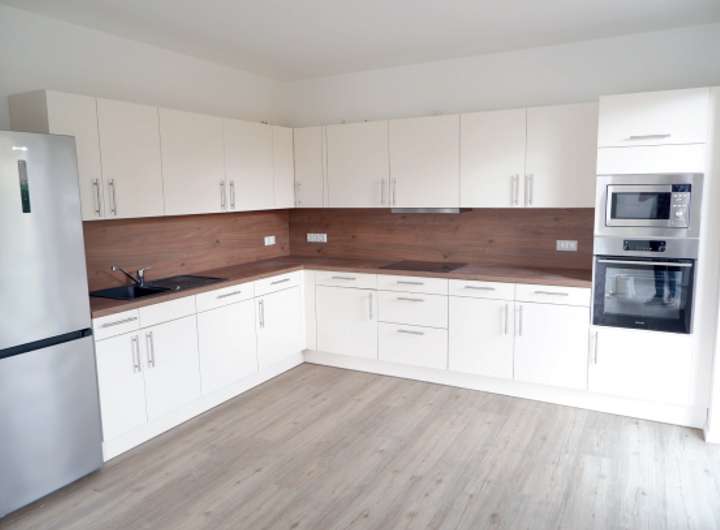 - helle Einbauküche mit Arbeitsplatte und Wandschild in Holzoptik, bestehend aus Cerankochfeld,