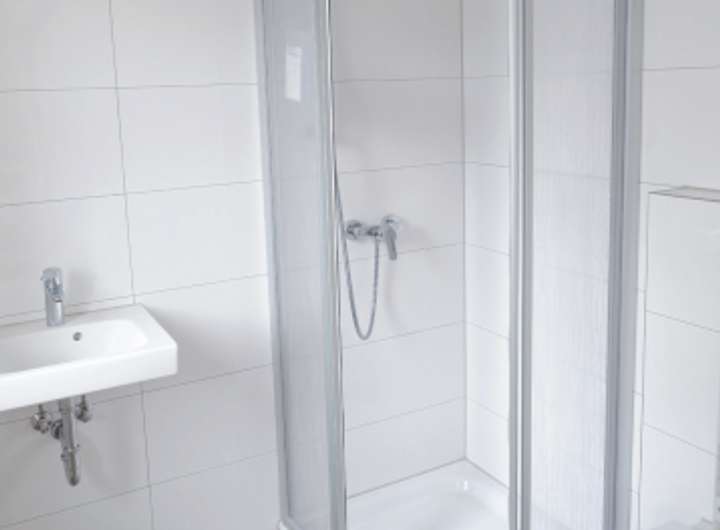 - Duschbad im Erdgeschoss, ausgestattet mit flacher Duschtasse mit Duschabtrennung, Waschtisch, wandhängendem WC, Fußbodenheizung; Sanitärobjektfarbe = weiß