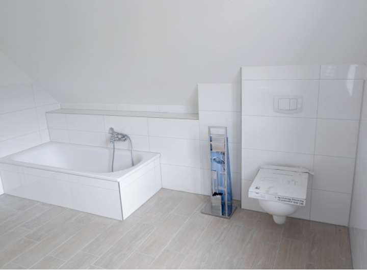 - Vollbad im Dachgeschoss mit Badewanne, gefliesten Duschboden mit Duschabtrennung in Glas, Waschtisch, wandhängendem WC, Fußbodenheizung; Sanitärobjektfarbe = weiß
