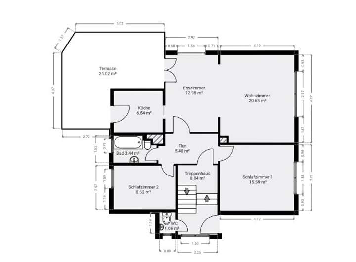 •Erdgeschoss (ca. 85 m²): 3 Zimmer, Küche, Tageslichtbad sowie eine Terrasse mit direktem Zugang zum Garten.
