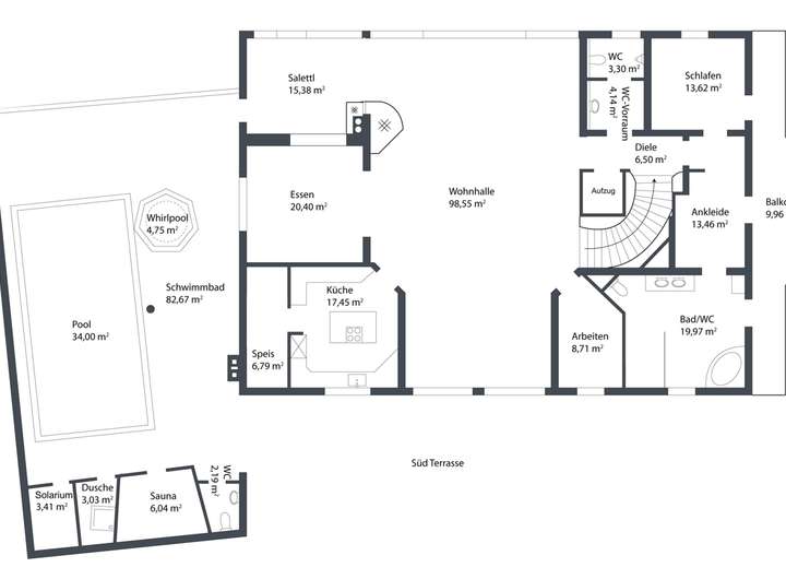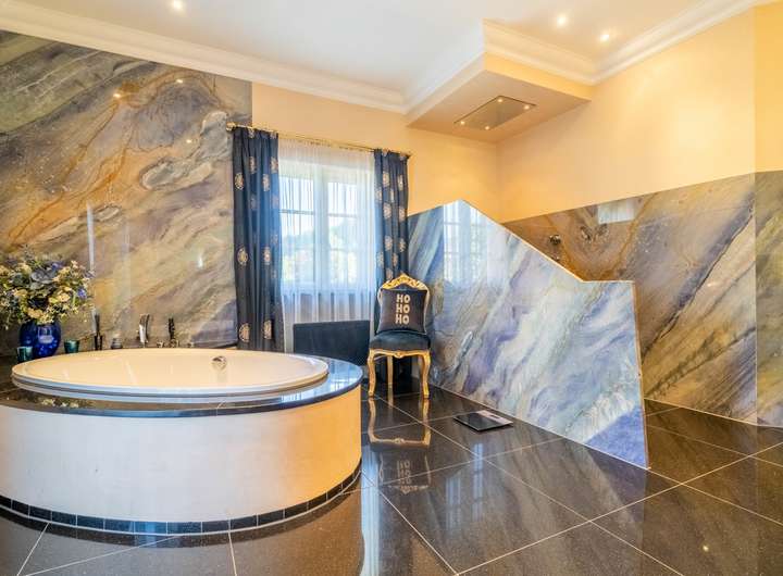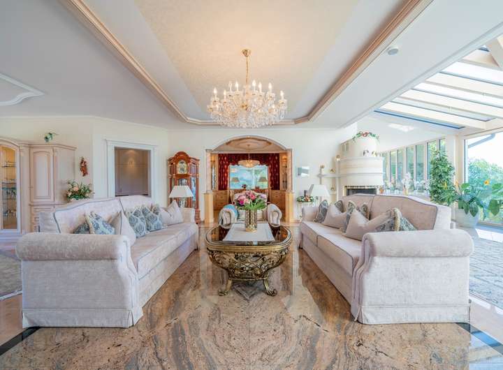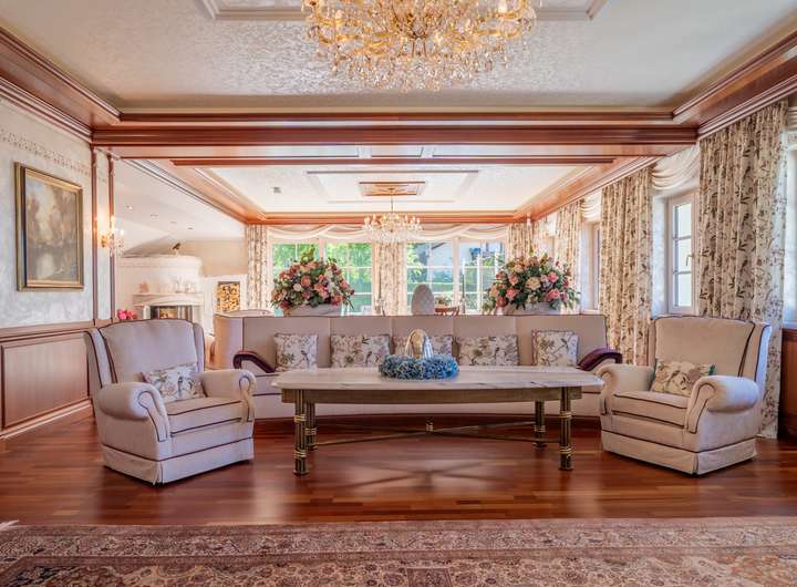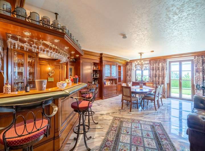 Das weitläufige Haus erstreckt sich über drei Ebenen und überzeugt durch Großzügigkeit, Lichtfülle und eine gehobene Ausstattung in klassischer Eleganz. Edle Materialien, durchdachte Raumkonzepte und ein stimmiges Farbspiel schaffen ein stilvolles Ambiente voller Wärme und Persönlichkeit. Der hauseigene Spa-Bereich erfüllt höchste Ansprüche an Entspannung und Wohlbefinden: Ein lichtdurchflutetes Schwimmbad mit Whirlpool, eine Sauna sowie ein separater Ruhebereich laden zum privaten Wellnessgenuss auf höchstem Niveau ein – zu jeder Jahreszeit. Das Raumangebot umfasst einen großzügigen Wohnbereich, ein Esszimmer sowie Salettl, eine Einbauküche mit verdecktem Zugang zu einer Speisekammer, ein Schlafzimmer mit angrenzendem Ankleidebereich und Badezimmer sowie ein Büro und ein Gäste WC. Im Obergeschoss befindet sich ein weitläufiges Büroloft mit angrezender Küche und Terrassenzugang sowie zwei Gästezimmer mit jeweils eigenem Bad und Balkonzugang. Durch die Hanglage hat auch die untere Ebene des Hauses Zugang zu einem eigenen Gartenbereich. Die Ebene beherbergt den Eingangsbereich des Hauses, ein Stüberl und einen Büroraum sowie einen Hauswirtschaftsraum, umfangreiche Stauräume und einen Technikbereich.