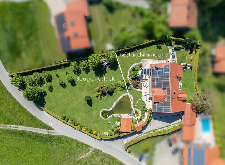 - 1.788m² unbebautes Grundstück mit Baurecht gemäß Bebauungsplan, derzeit als parkartiger Garten genutzt (Baurecht lt. Bebauungsplan: Grundfläche 190m², Wandhöhe 6m)