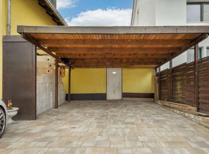 Ein liebevoll angelegter Garten lädt zum Spielen, Entspannen oder geselligen Grillabenden ein. Für Ihre Fahrzeuge stehen ein Carport mit Platz für zwei Autos sowie zwei weitere Außenstellplätze zur Verfügung.