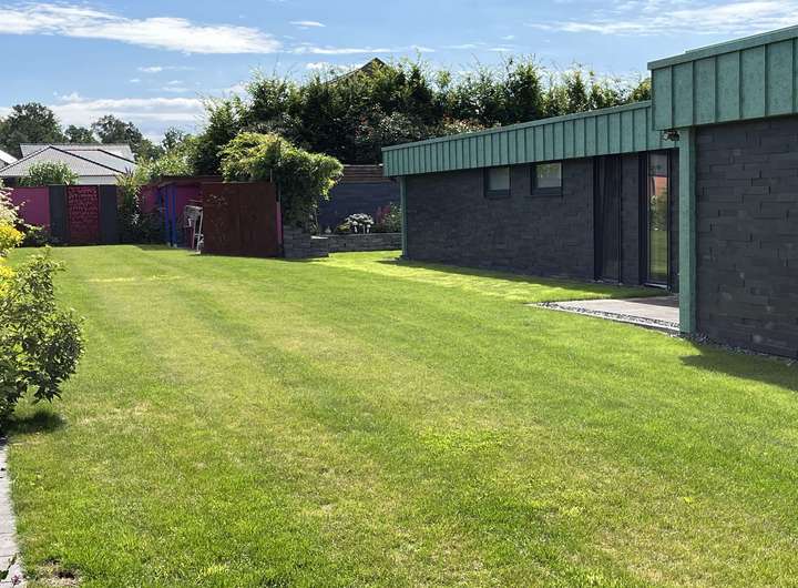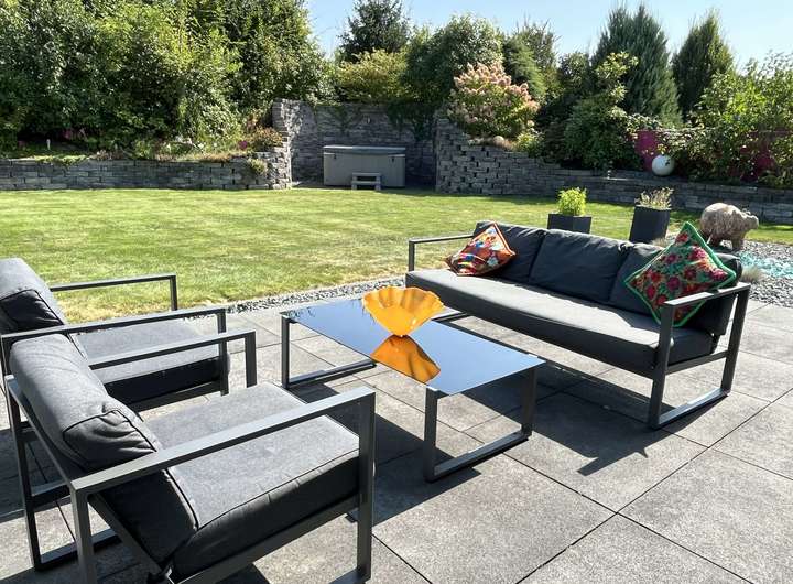 Der Ausblick vom Wohnzimmer in den Garten ist einmalig schön. Die großen Rasenflächen strahlen Ruhe aus und der Blick verfängt in den blühenden Beeten, die den Garten säumen. Geschickt sind Jacuzzi und Gerätehäuschen in die Gartengestaltung, die ein hohes Maß an Privatsphäre anstrebte, integriert. Traumhaft sind auch die großzügigen Terrassen zum Entspannen oder für Partys mit netten Gästen. Die praktische Außenküche sorgt für kurze Wege und Spaß beim gemeinsamen Grillen.