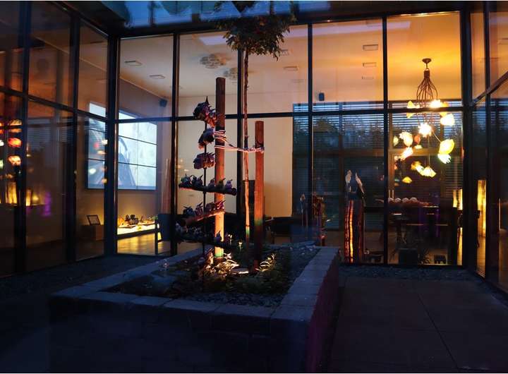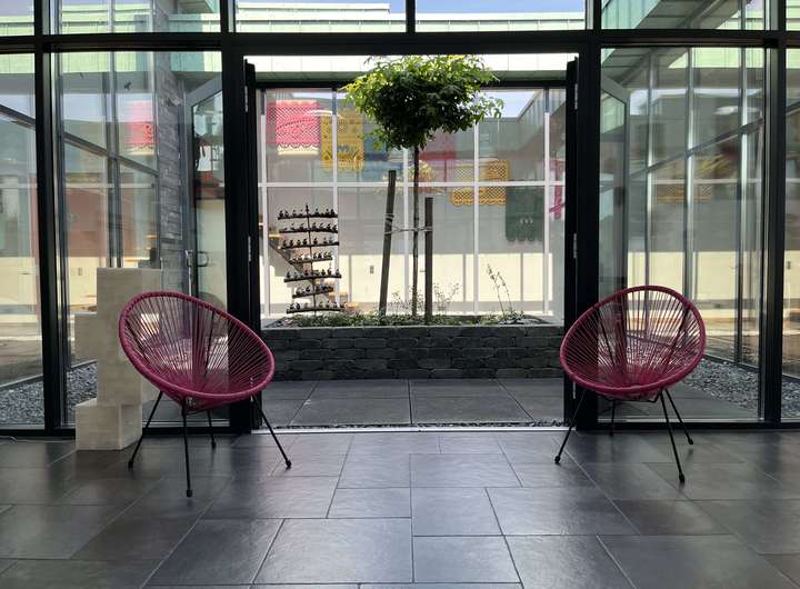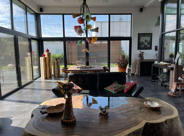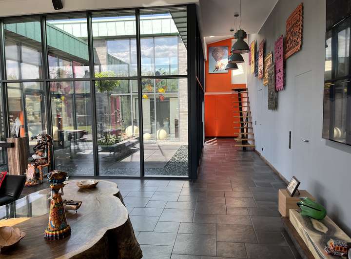 Den attraktiven Mittelpunkt dieses Unikats bildet das Atrium. Um diesen formal gestalteten Innenhof gruppieren sich die Räume und Flure. Aufgrund der großflächigen Verglasungen ergeben sich aus unterschiedlichen Perspektiven interessante Blickachsen. Faszinierend!