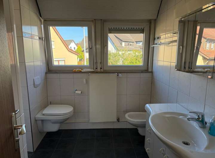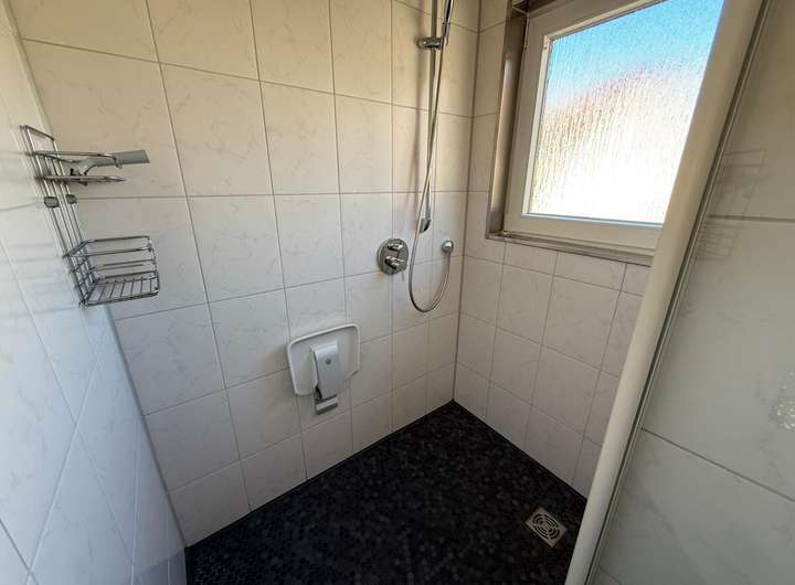 Das Badezimmer wurde bereits 1990 erneuert und verfügt über eine begehbare Dusche. Die Wände sind klassisch mit Tapeten versehen.