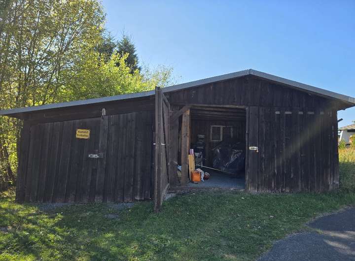 Das Nebengebäude – Baujahr unbekannt - ist unterteilt in 2 Abstellflächen, die jeweils über ein Doppelflügeltor verfügen und somit auch anfahrbar sind.