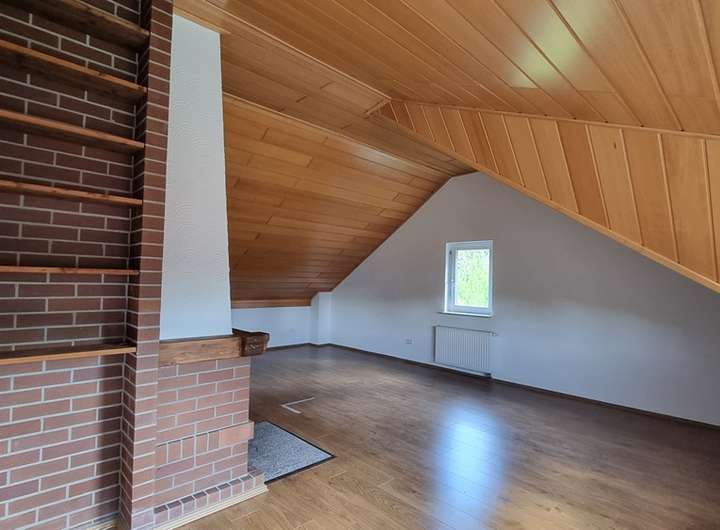 Über die Treppe gelangen Sie in das Dachgeschoß. Hier befindet sich ein kleines Arbeits-/ Ankleidezimmer, WC und ein großes, helles Zimmer mit Kamin, welches ursprünglich als Wohnzimmer diente. Hier steckt auch einiges an Potential und Fläche um diesen großen Raum zu teilen. Mit ein wenig handwerklichem Geschick ist das kostengünstig erledigt.