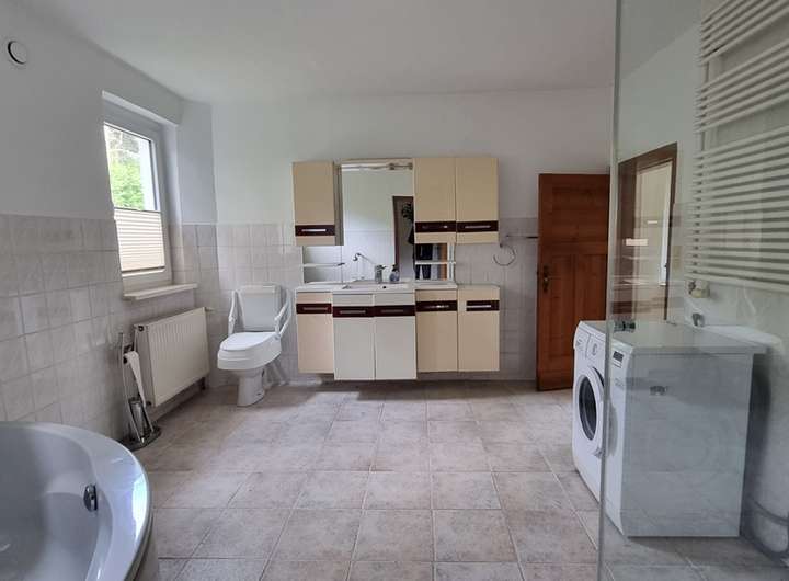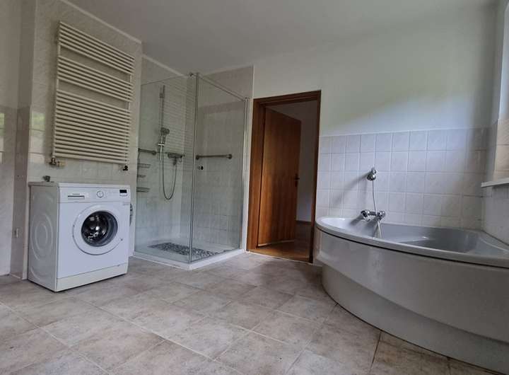 Im Erdgeschoss betreten Sie das Haus über den Windfang in die schöne große Küche. Von hier aus gelangen Sie über das Ess-/ Wohnzimmer in das großzügige Bad mit bodengleicher Dusche und großer Eckbadewanne und weiter geht es dann in ein Schlafzimmer.