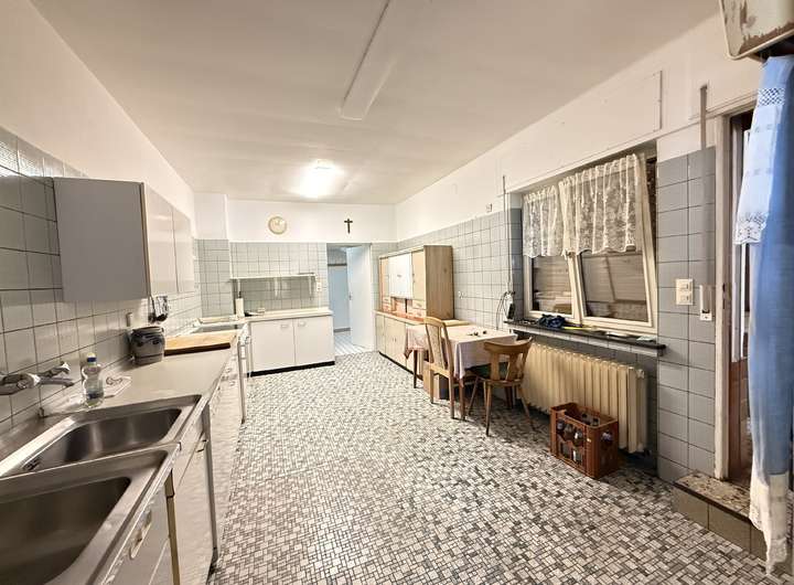 - Erdgeschoss: ca. 56 m² große 2-Zimmer-Wohnung mit Küche und Bad. Gsstraum mit Sanitärbereich, Küche/Spülküche/Lagerräume, Kühlraum usw. Terrasse, teils überdacht. Lager- und Vorratsräume, ein Lagerraum mit Warmwasserspeicher.