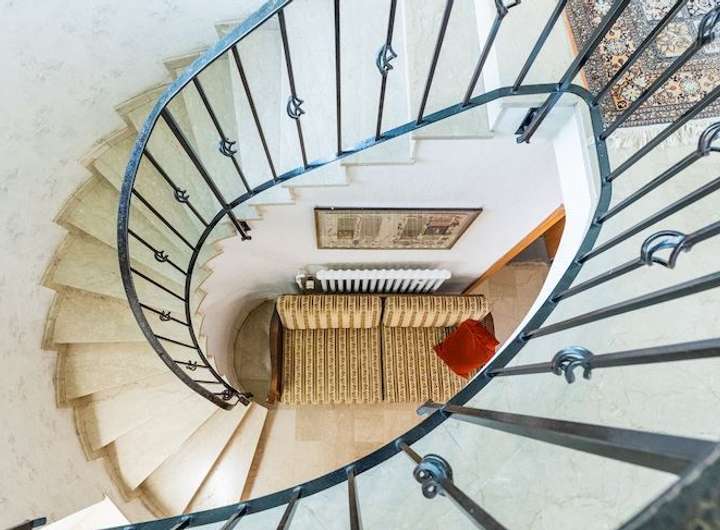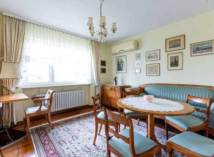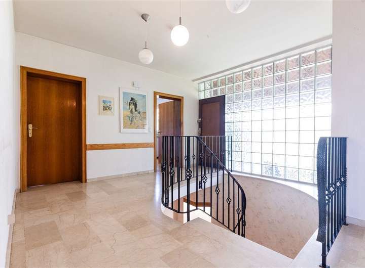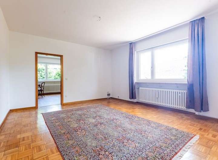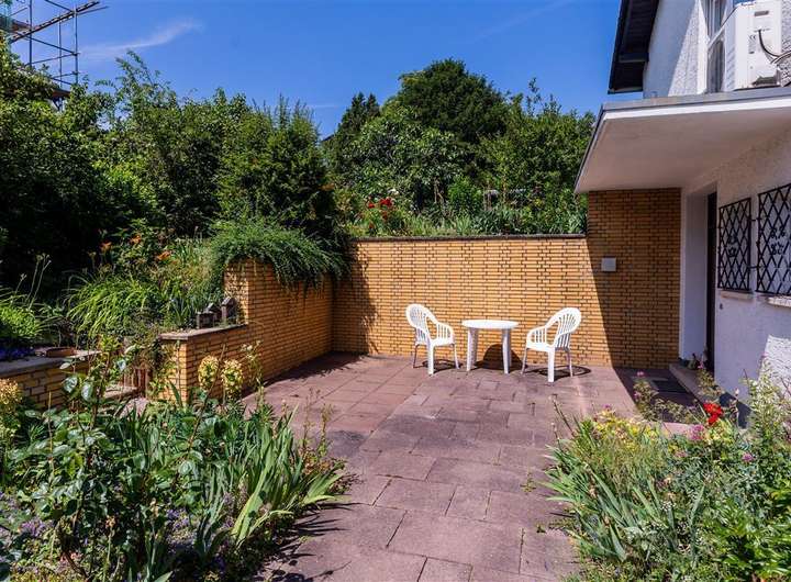 Geradeaus durch den Eingangsbereich führt der Weg weiter ins großzügige, helle Treppenhaus mit Marmorbelag, das zur Hauptwohnung im Obergeschoss sowie in die ebenerdigen Kellerräume führt. Im Obergeschoss erwartet Sie ein großzügiger, gut gegliederter Grundriss mit viel Wohnkomfort. Direkt vom Treppenhaus aus betreten Sie eine geräumige Diele, von der aus sich alle Räume erschließen. Das Gäste-WC mit Tageslicht befindet sich ebenfalls im Eingangsbereich. Die separate Küche ist direkt von der Diele zugänglich und bietet kurze Wege zum Essbereich. Das großzügige Wohn-/Esszimmer ist durch einen offenen Rundbogen verbunden und besticht durch große Fensterflächen, viel Licht sowie direkten Zugang zum überdachten Balkon mit herrlichem Fernblick über die Umgebung. Das Wohnzimmer ist mit einem hochwertigen, strapazierfähigen Mecrusse -Parkettboden ausgestattet. Der private Bereich der Wohnung umfasst ein großes Schlafzimmer mit Eichenholzparkett, zwei Kinderzimmer, ein weiteres kleines Zimmer (z. B. als Büro oder Gästezimmer), ein Ankleide-/Abstellraum sowie ein Tageslichtbad mit Badewanne und Dusche. Ein besonderes Highlight ist der ebenerdige Zugang vom Flur aus in den hinteren Gartenbereich, der sich durch die Hanglage auf Gartenniveau öffnet. Der liebevoll angelegte Garten bietet sonnige Sitzplätze – teilweise überdacht – und ist durch hohe Hecken komplett sichtgeschützt. Dank verschiedener Wege rund ums Haus hat jede Wohneinheit ihren eigenen Zugang zum Außenbereich.