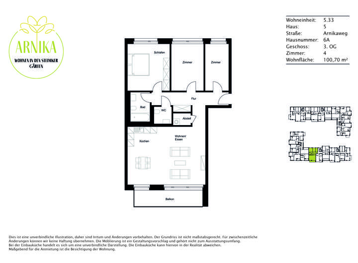 Das Wohnprojekt ARNIKA befindet sich im Herzen des neuen Stadtquartiers Steimker Gärten, welches durch seine idyllische Lage im Grünen und gleichzeitige Nähe zur urbanen Infrastruktur besticht. Die offenen, hellen Räume und großzügigen Grundrisse des 5-geschossigen Gebäudes versprechen ein zeitgemäßes Wohnvergnügen auf höchstem Niveau. Das Areal verfügt über einen grünen Innenhof sowie eine ressourcensparende Stromversorgung.