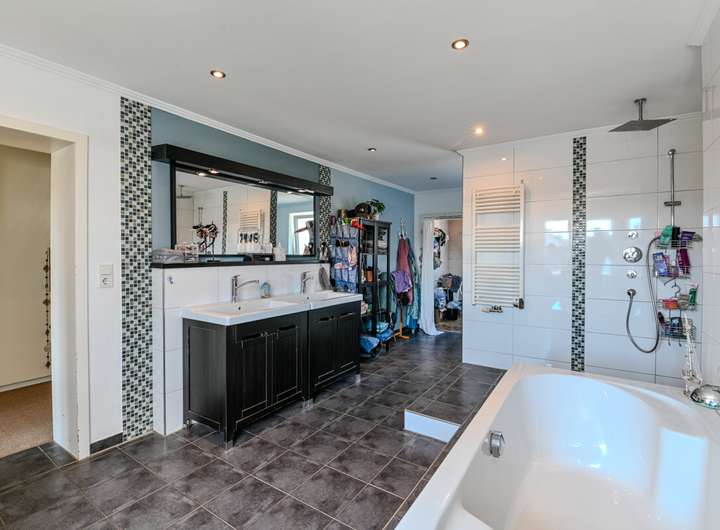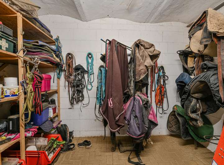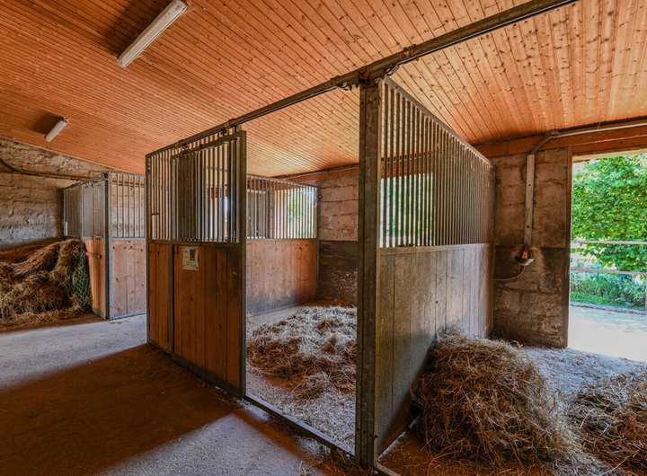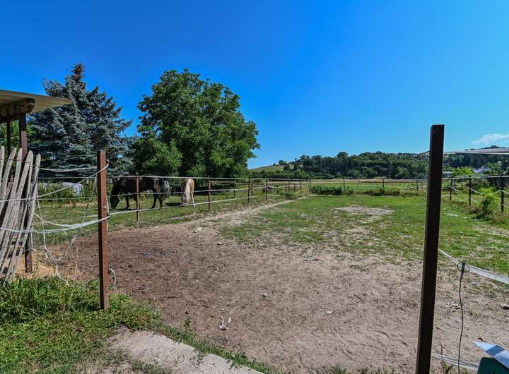 Besonders beeindruckend ist die weitläufige Außenanlage: Über 3.000 m² Grundstück mit Sandplatz, befestigten Wegen und Stallungen schaffen beste Voraussetzungen für Pferdehaltung, kleine Landwirtschaft oder einfach viel Bewegungsfreiheit.