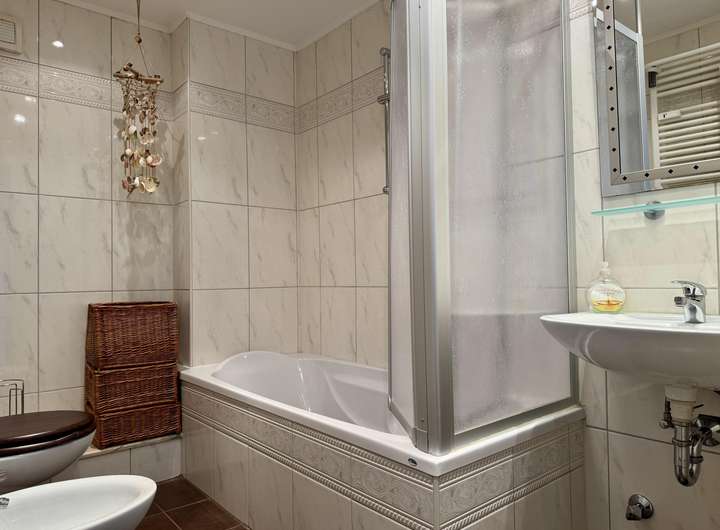 Das Schlafzimmer bietet ausreichend Platz für eine gemütliche Einrichtung und schafft einen Rückzugsort zum Erholen. Das Badezimmer ist mit einer Badewanne ausgestattet und sorgt für zusätzlichen Komfort.