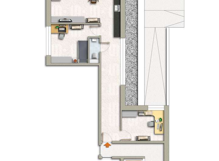 Neben dem Schlafzimmer, zwei weiteren Räumen und einem Badezimmer inkl. Dusche und Waschmaschinenanschluss stehen Ihnen ein großzügiger Wohn-/ Essbereich sowie ein Balkon zur Verfügung. Highlight der Wohnung ist die elegante, in Weiß gehaltene Einbauküche inkl. hochwertiger Elektrogeräte der Firma NEFF und Franke.