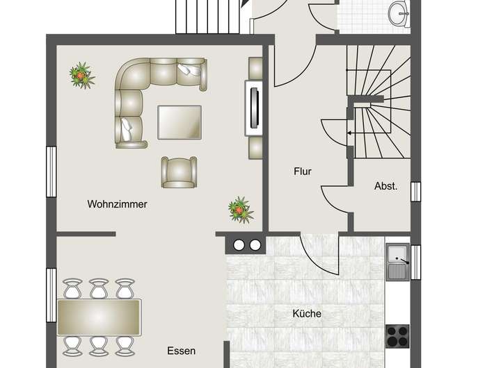 Im Erdgeschoss gelangen Sie über die Eingangsdiele zunächst zum Windfang mit dem Gäste-WC, die Diele zur rechten führt Sie zum offenen Küchenbereich mit Terrassenzugang sowie zum Wohn-/Esszimmer.
