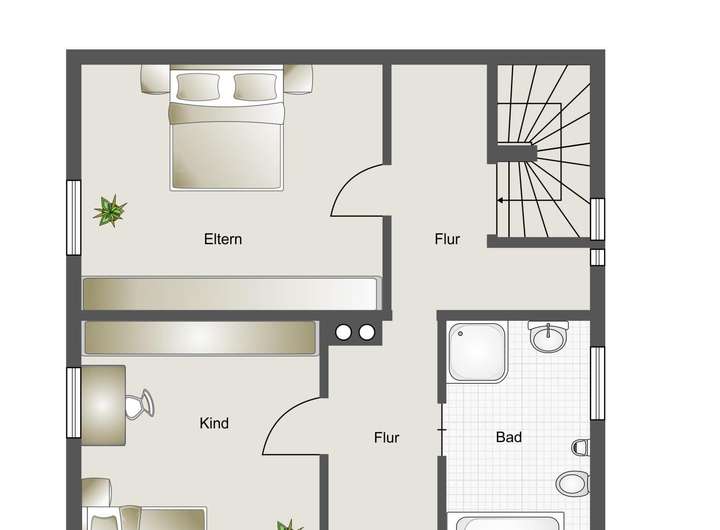 Im Dachgeschoss befinden sich das Elternschlafzimmer, zwei Kinderzimmer sowie das Badezimmer mit Wanne und Dusche.