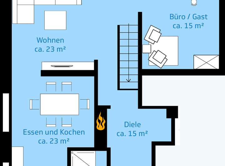 Im Erdgeschoss erwartet Sie ein großzügiger Wohnbereich mit angrenzender Wohnküche, der durch große Fenster viel Licht erhält und direkten Zugang zur Terrasse bietet. Die Diele und das Esszimmer werden durch einen gemütlichen Kachelofen ergänzt, der eine behagliche Atmosphäre schafft. Ein zusätzliches Zimmer kann als Büro oder Schlafzimmer genutzt werden. Außerdem befinden sich im Erdgeschoss ein praktischer Hauswirtschaftsraum sowie ein Gäste-WC mit Dusche.
