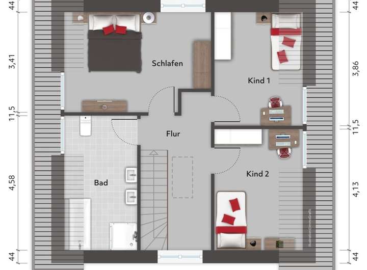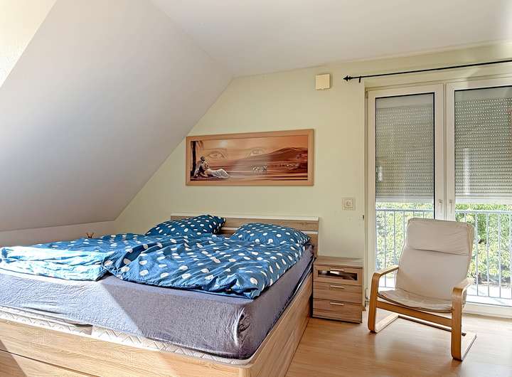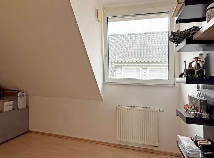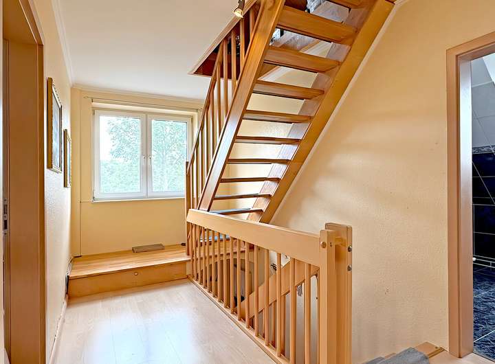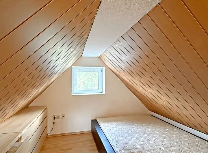 Über eine Treppe gelangen Sie in den ausgebauten Spitzboden, in dem sich ein weiteres Zimmer befindet – ideal als Gästezimmer, Hobbyraum oder Home-Office. Die hellen Materialien, gleichmäßigen Oberflächen und gemütlichen Farben schaffen eine behagliche Atmosphäre.