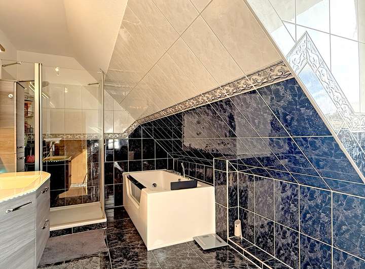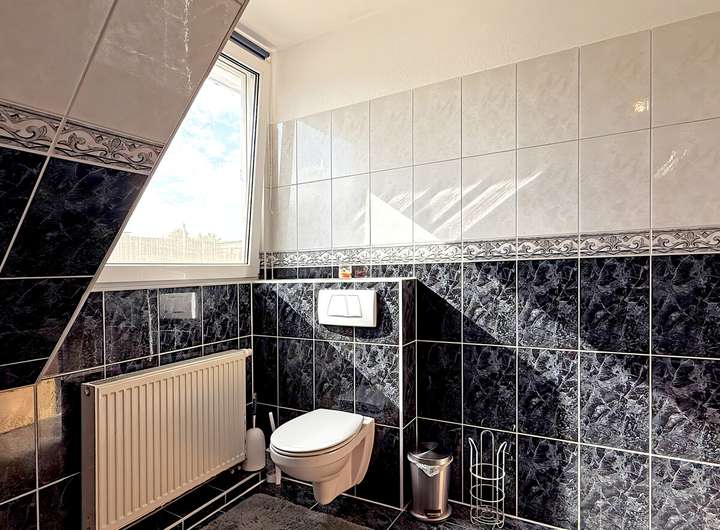 Drei gut proportionierte Schlafzimmer sowie ein großes Vollbad mit Fenster sorgen für ausreichend Platz. Die Raumaufteilung ist flexibel – ideal für eine Familie, das Wohnen auf zwei Ebenen oder als Praxis/Arbeitsraum.