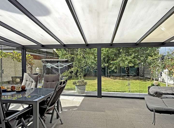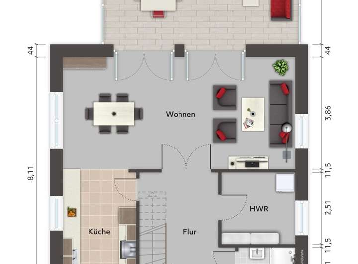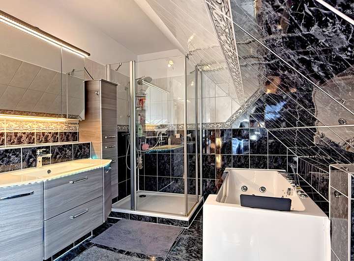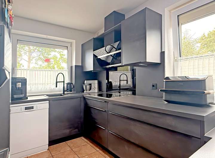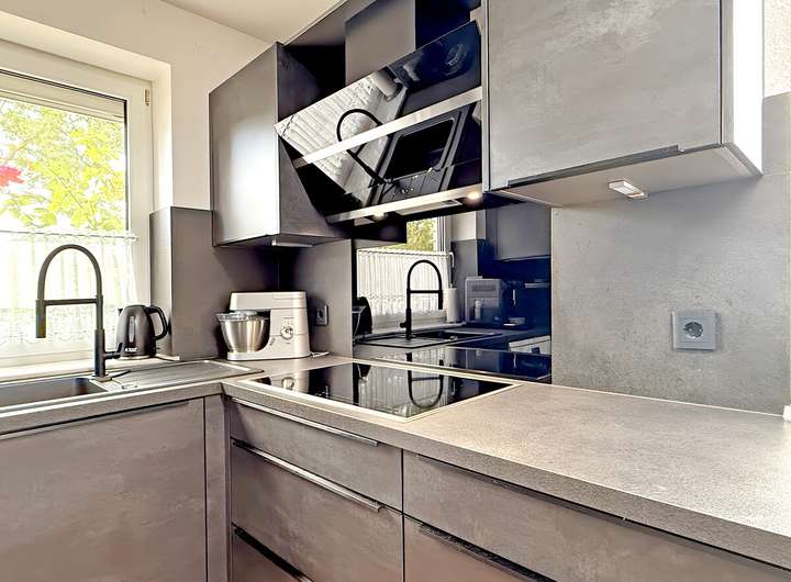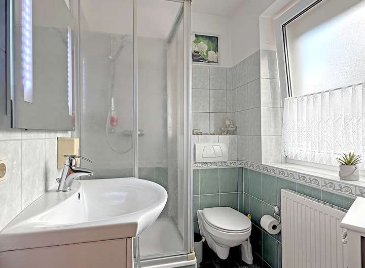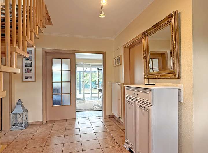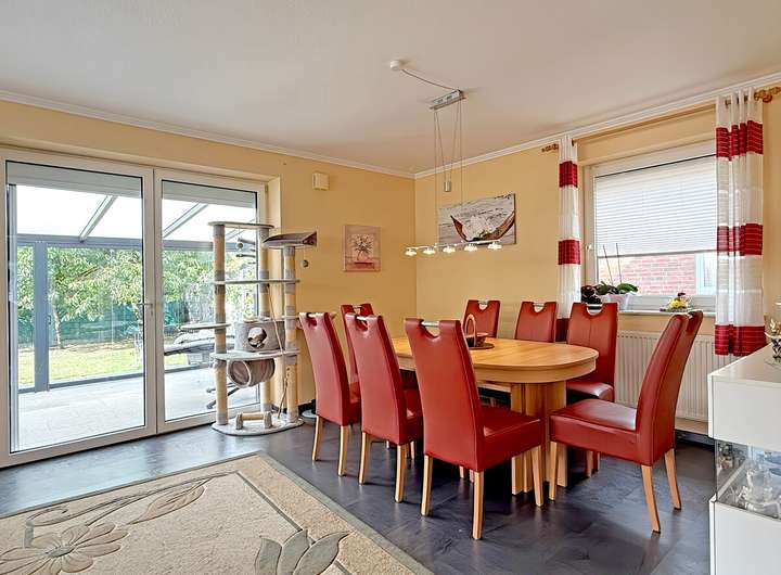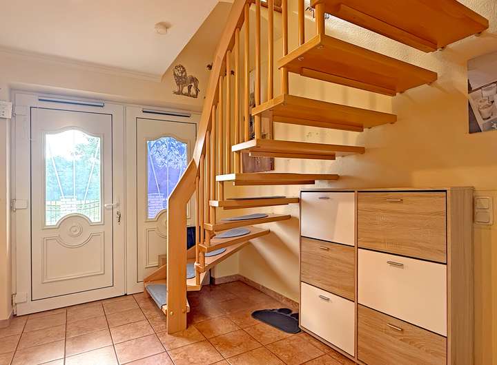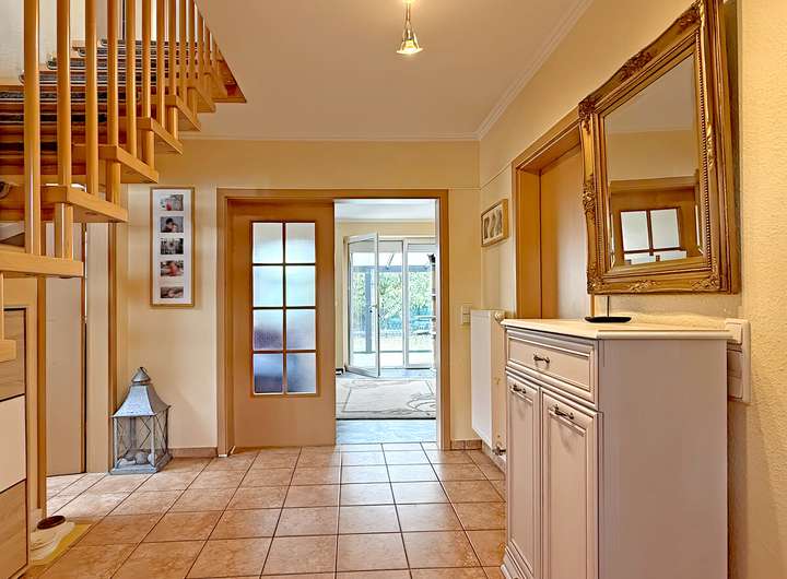 Durch den Eingangsbereich gelangen Sie in den hellen Wohnbereich. Das Wohnzimmer öffnet sich zum Wintergarten – ein Ort zum Relaxen, Lesen oder Geselligkeit mit Blick ins Grüne. Die Küche besticht durch hochwertige Ausstattung; 2022 wurde eine Einbauküche installiert. Ein modernes Duschbad mit Fenster vervollständigt das Erdgeschoss. Ein großzügiger Hauswirtschaftsraum bietet viel Stauraum und Platz für Waschmaschine und Trockner - ein Starkstromanschluss ist vorhanden. Die Räume sind großzügig und warm gestaltet.