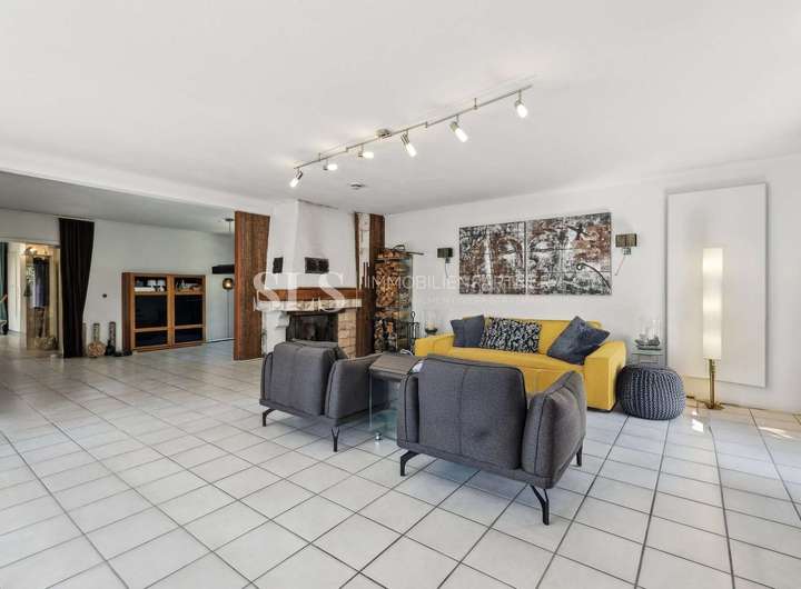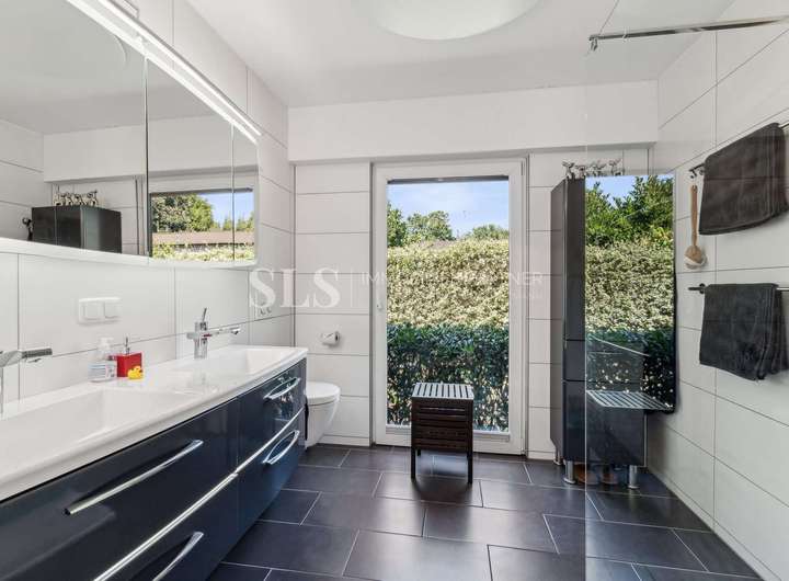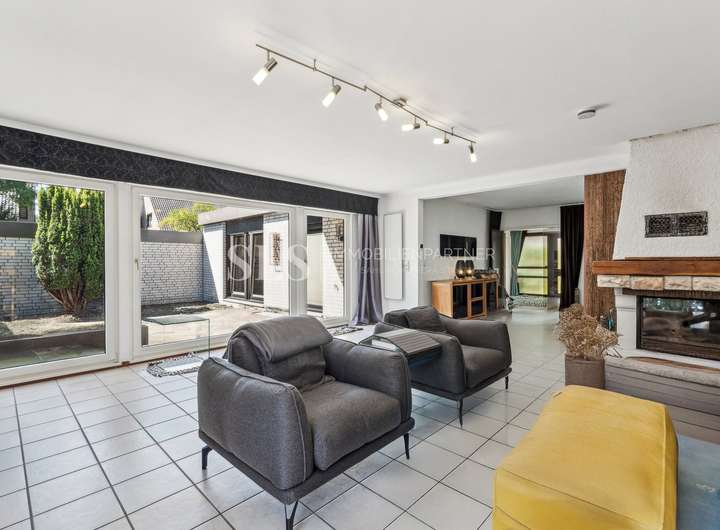 Das Herzstück des Hauses ist der lichtdurchflutete Wohn- und Essbereich. Durch große Fensterfronten fällt viel Tageslicht hinein und eröffnet den Blick auf die Terrasse und den Garten. Ein Kamin sorgt in den kühleren Monaten für wohlige Wärme und verleiht dem Raum eine behagliche Atmosphäre.