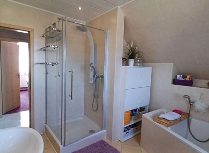 Durch die offene und helle Treppe gelangen Sie ins Dachgeschoss, welches mit drei Schlafzimmern sowie einem großen Bad mit Dusche und Wanne ausgestattet ist.