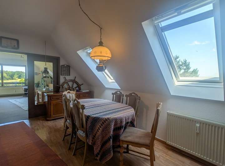 Diese überzeugt durch ihre geräumige Aufteilung sowie den herrlichen Balkon mit Blick über den Garten und die Schlei. Die Wohnung umfasst ein großzügiges Wohn- und Esszimmer, eine Küche, ein Schlafzimmer, ein weiteres Zimmer, ein helles Tageslichtbad mit Badewanne und Dusche sowie einen praktischen Abstellraum innerhalb der Wohnung.
