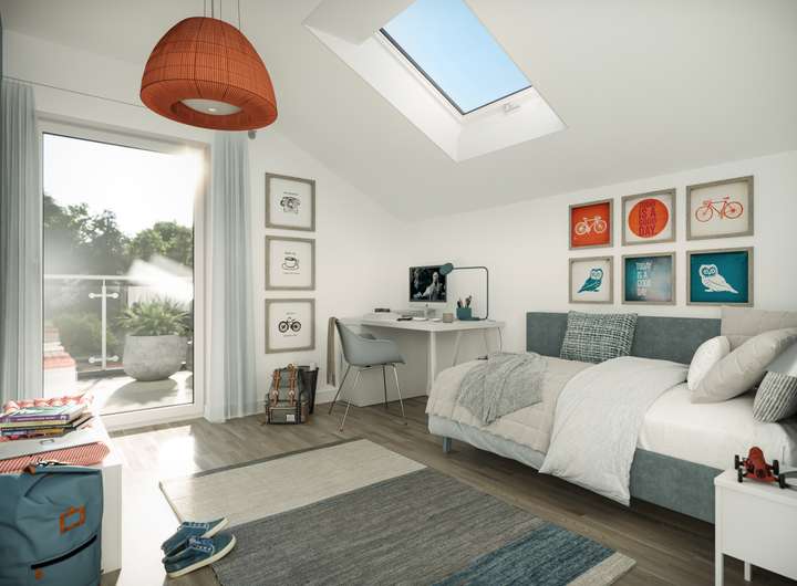 - Dachflächenfenster mit Kipp- und Schwingfunktion sowie elektrischen Rollläden*, wenn laut Grundriss enthalten