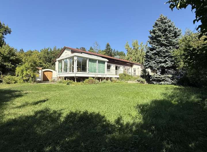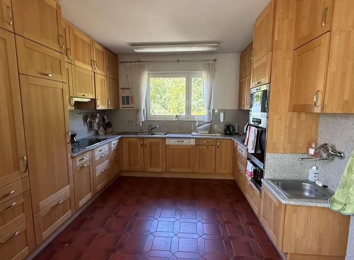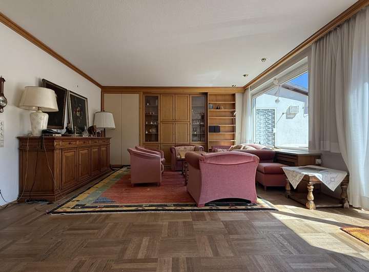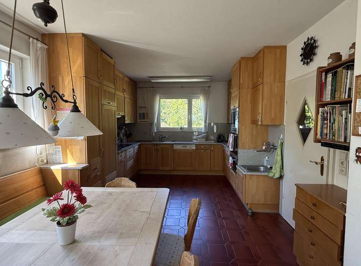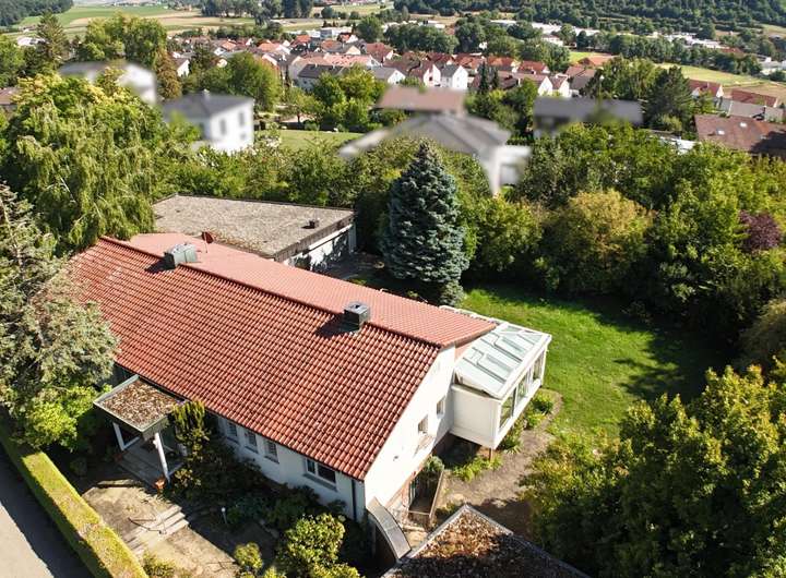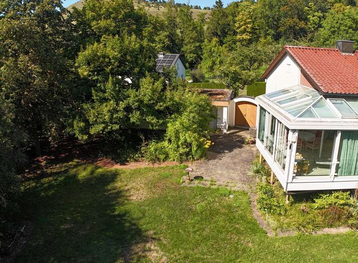 Der Wohnbereich beeindruckt durch seine Offenheit und Transparenz und durch überdurchschnittliche Raumhöhen. Erlesene Holzböden, großflächige, nach Süden ausgerichtete, raumhohe Fensterelemente, eine gemütliche und großzügige Wohnküche sowie ein sonniger, vollverglaster Wintergarten unterstreichen das gehobene Wohnambiente. Drei individuell nutzbare Zimmer, ein Badezimmer und ein Gäste-WC vervollständigen diese Wohnebene. Die großen, zur Gartenseite geöffneten Fensterflächen sowie der angrenzende Terrassenbereich schaffen einen fließenden Übergang vom Haus in den Garten. Verschiedene Anpflanzungen zieren dieses Grundstück. In unmittelbarer Nähe zum Grundstück befinden sich weitläufige Wiesen und der Ipf.