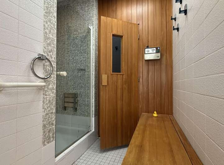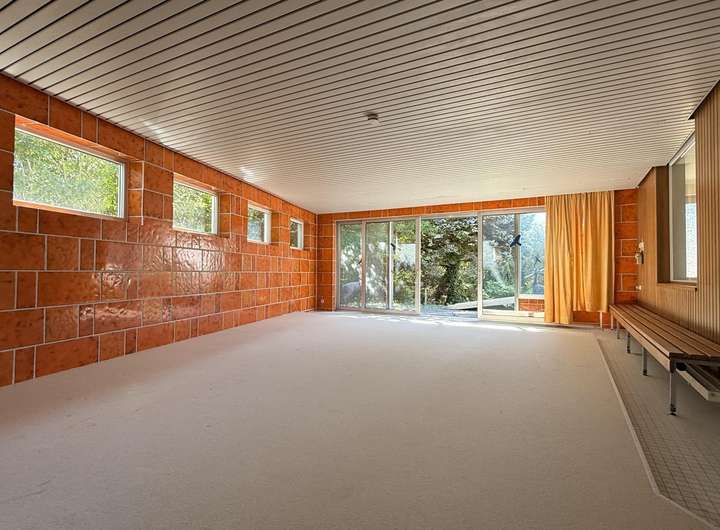 Der Schwimmbadtrakt, ausgestattet mit Dusche und Sauna sowie freiem Zugang in den Garten, bietet zusätzliche Entspannungsmöglichkeiten.