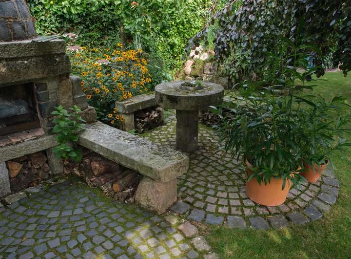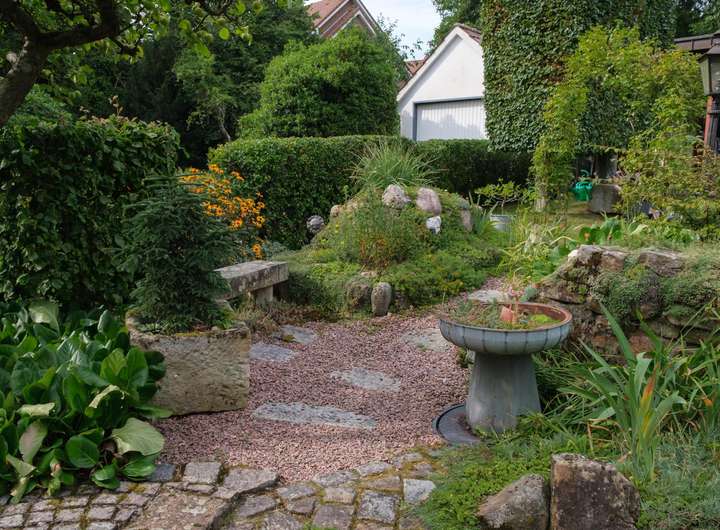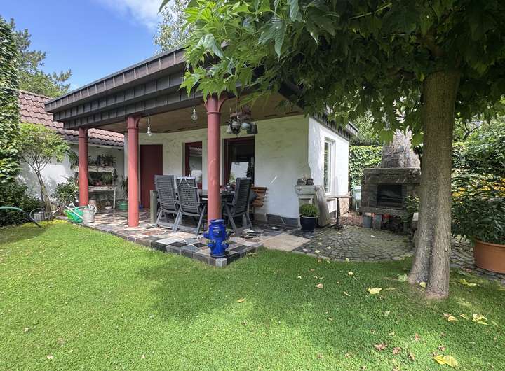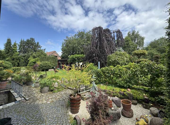 Der Außenbereich lässt keine Wünsche offen: Der gestalterisch wertvolle Garten bietet vielfältige Möglichkeiten zur Erholung. Ob Familienfeste, entspannte Grillabende oder ruhige Stunden im Grünen – hier findet jeder seinen Lieblingsplatz. Ein Gartenhaus bietet zusätzlichen Stauraum, und auf der Terrasse lässt sich die Sonne wunderbar genießen. Für die nachhaltige Gartenbewässerung steht eine 3.500 Liter fassende Zisterne zur Verfügung – besonders praktisch in den Sommermonaten.