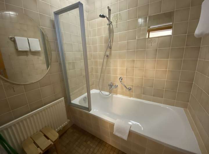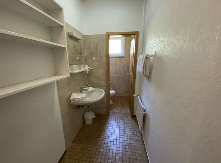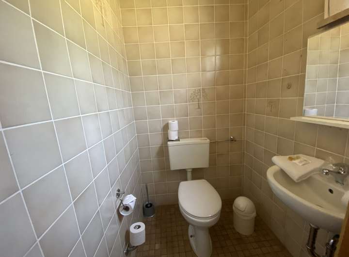 Das Wäschelager verfügt über ein Zimmer mit Kochnische und ein Bad mit WC, Waschbecken und Dusche.