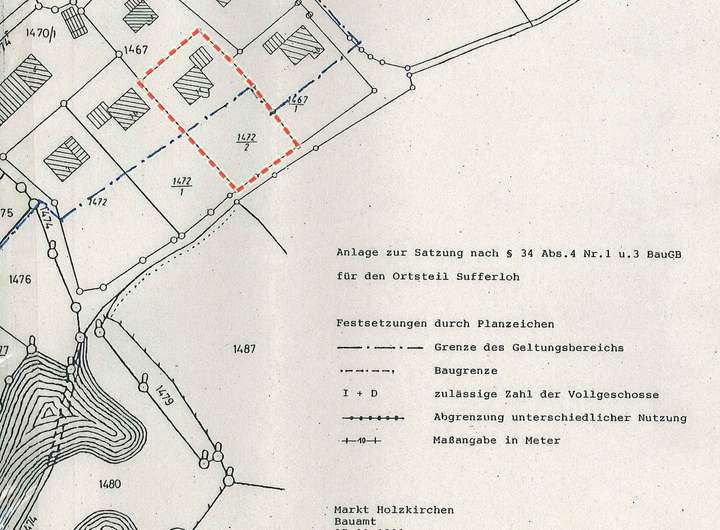 Durch eine Ortsabrundungssatzung wurde festgelegt, dass nur im rund 750 qm großen oberen Grundstücksteil gebaut werden darf. Dabei ist sowohl ein Einfamilienhaus als auch ein Doppelhaus aufgrund der Umgebungsbebauung denkbar.