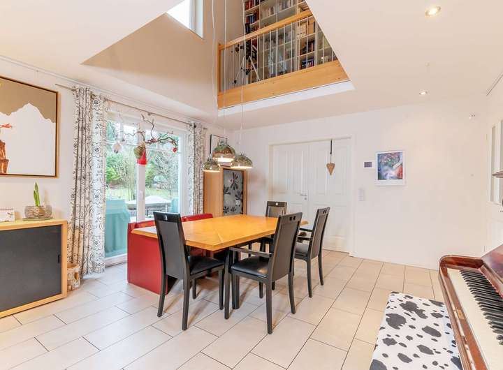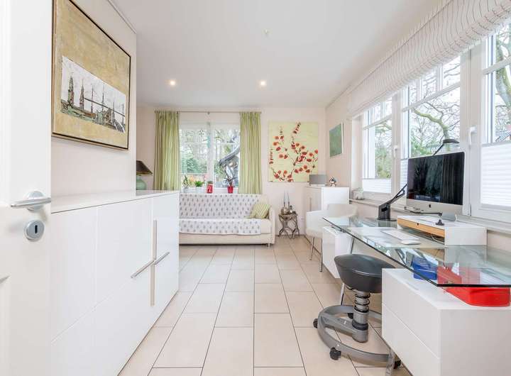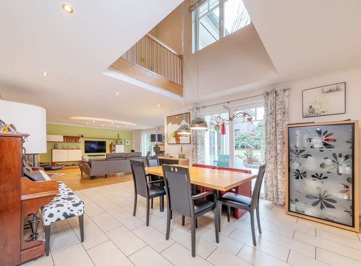 Das Erdgeschoss empfängt Sie mit einem großzügigen Eingangsbereich, der in ein helles Büro, ein Gästezimmer sowie ein stilvolles Badezimmer mit Badewanne übergeht. Der lichtdurchflutete Wohnbereich besticht durch seine südliche Ausrichtung zum Garten und schafft mit einem Kamin sowie einem offenen Essbereich mit einem Luftraum eine besondere Wohlfühlatmosphäre. Angrenzend daran befindet sich die moderne Einbauküche mit praktischem Vorratsraum. Große, teils bodentiefe Fenster lassen viel Licht in alle Räume und schaffen ein luftiges und offenes Wohngefühl.