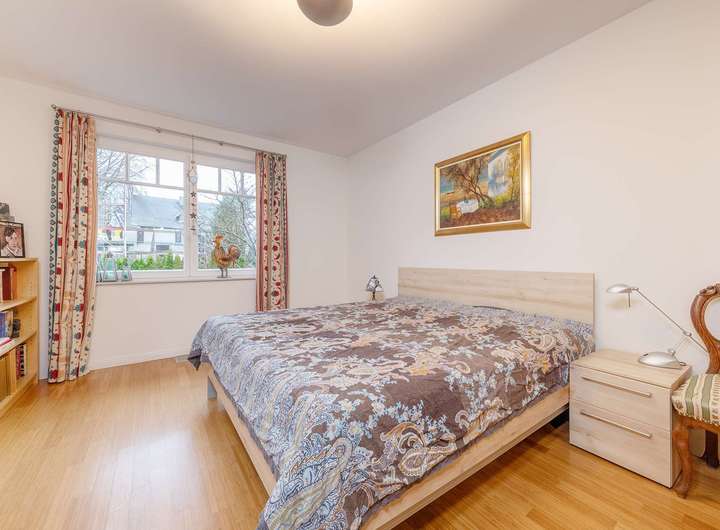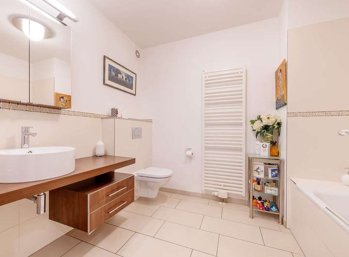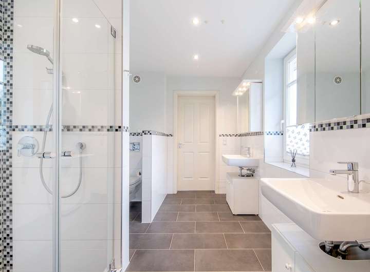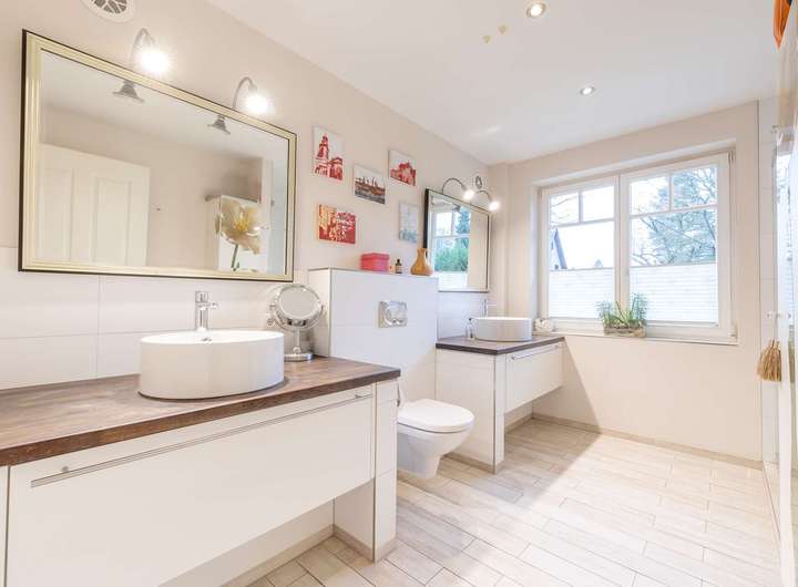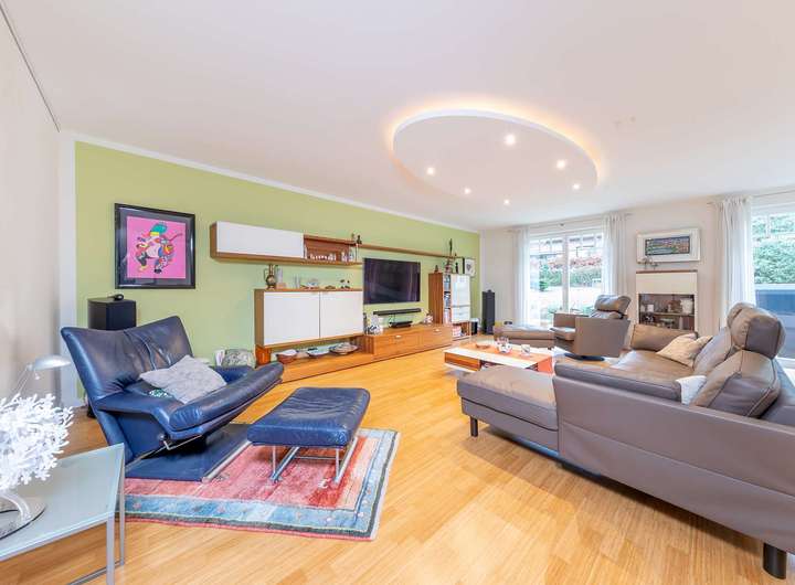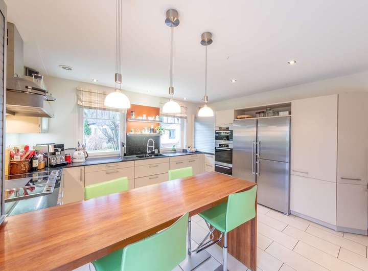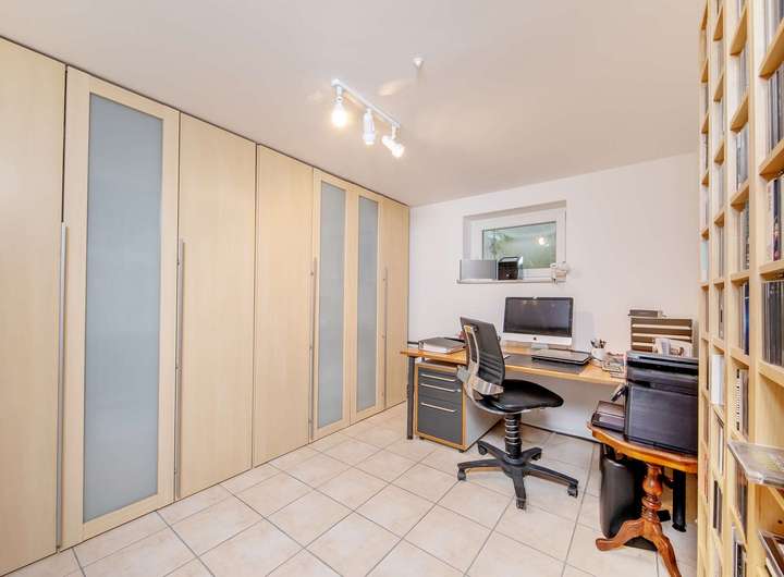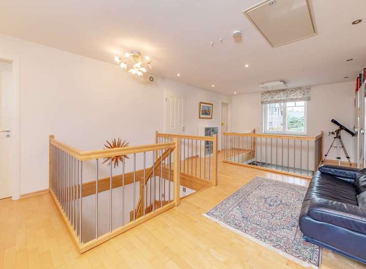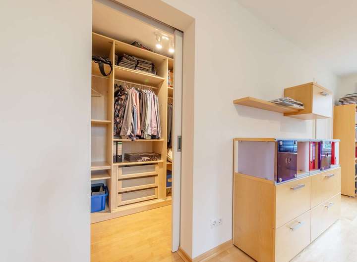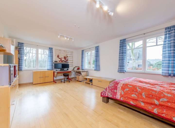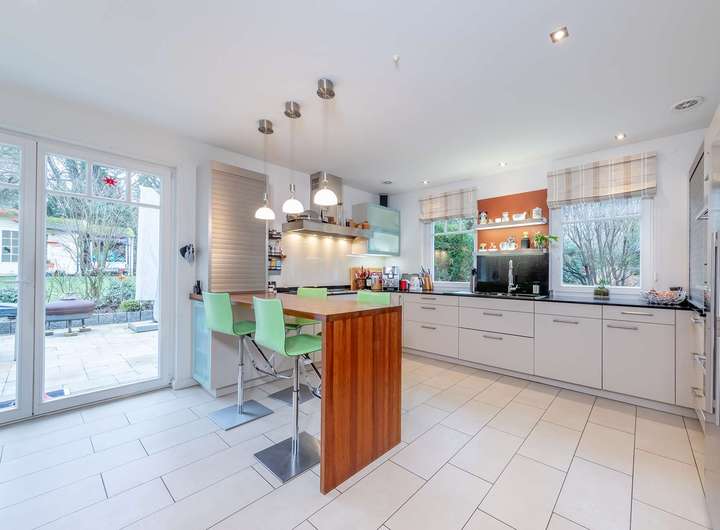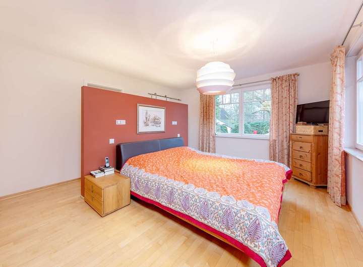 Für höchsten Komfort sorgen die Echtholzparkett- und Fliesenböden sowie eine Fußbodenheizung in allen Räumen. Das moderne BUS-System (LCN) ermöglicht individuelle Lichtszenarien und eine komfortable Temperaturregelung. Für den nötigen Stauraum und Organisation wurden diverse Einbauschränke auf allen Etagen verbaut.
