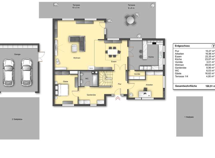 Für Ihre Fahrzeuge bietet die private Garage zwei Stellplätze sowie direkten Zugang zum Garten. Weitere Stellplatzmöglichkeiten für drei weitere Fahrzeuge befinden sich direkt vor der Garage und vor dem Garten (siehe Grundriss).