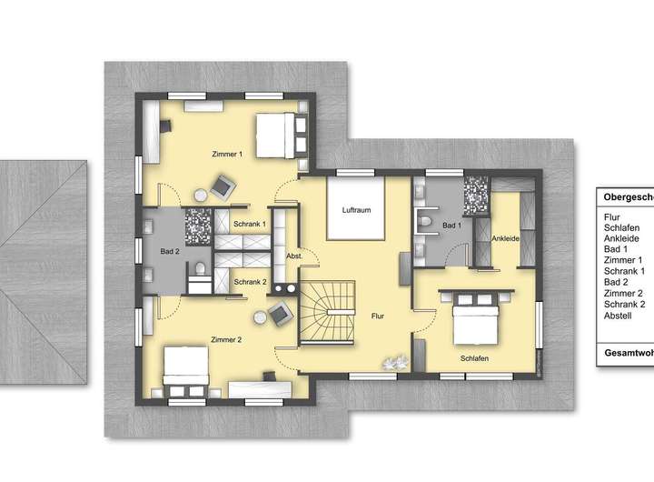 Im Obergeschoss erwartet Sie der großzügige Masterbedroom, der über eine eigene Ankleide und ein Tageslichtbad mit Dusche verfügt. Zwei weitere Schlafzimmer, ebenfalls mit eigenen Ankleiden, teilen sich ein Bad en Suite mit Dusche und Tageslicht. Ein Hauswirtschaftstraum für Handtücher, Bettwäsche, sowie ein Wäscheabwurf in den Keller ist ebenfalls vorhanden. Der weitläufige Galeriebereich im Obergeschoss bietet zusätzlichen Platz für persönliche Entfaltung.