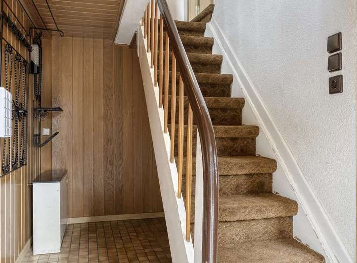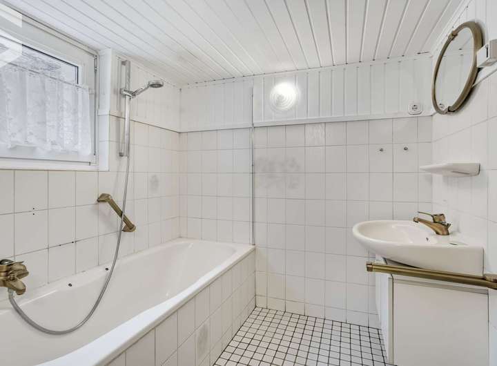 Beim Betreten des Hauses gelangt man in die zentrale Diele, von der alle Räume des Erdgeschosses sowie das Obergeschoss erreichbar sind. Zunächst erreicht man die Küche, die durch ihre zentrale Lage kurze Wege ermöglicht und sich ideal mit dem angrenzenden Wohnbereich verbindet. Das Wohnzimmer bietet einen gemütlichen Platz zum Entspannen und Wohnen. Ebenfalls von der Diele zugänglich ist das zeitlose Badezimmer mit Badewanne. Den Abschluss bietet die großzügige Terrasse, die viel Platz für erholsame Stunden im Freien bietet.