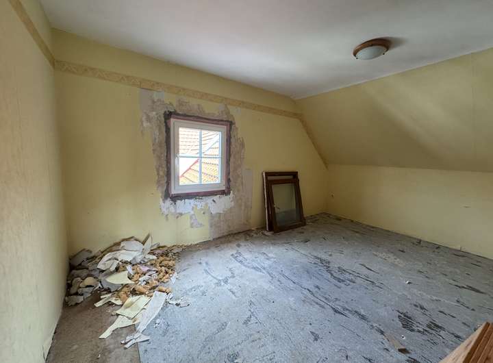 - Vorderhaus rechts ca. 117m² Wohnfläche, größtenteils unsaniert, aber grob entkernt und mit grober Elektro-Vorinstallation , 7 Zimmern und älterem Bad