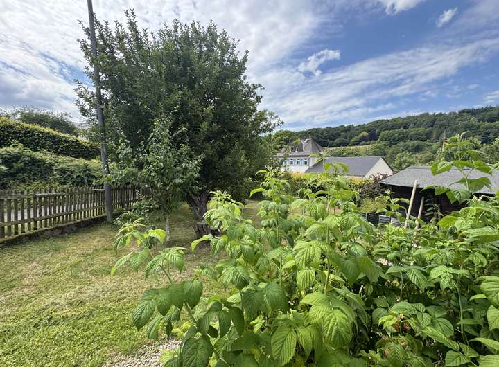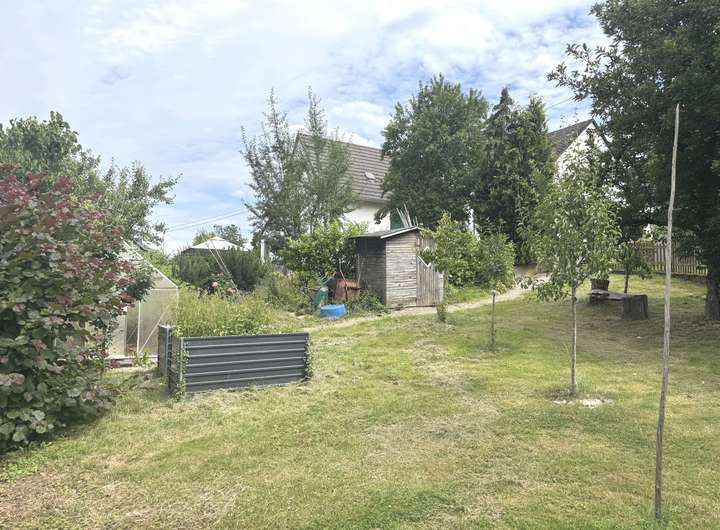 - 440 m² großer Gartenteil mit Obstwiese, kleinem Gewächshaus, Gartenschuppen, Kieselsteinwegen und -flächen.