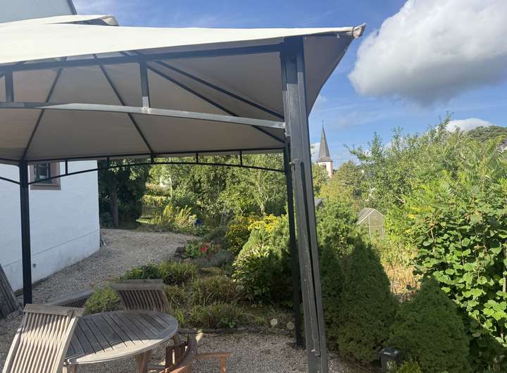 - idyllischer Innenhof mit angrenzende, durch einen Pavillon überdachte Kieselsteinfläche,