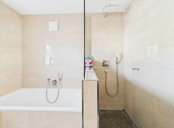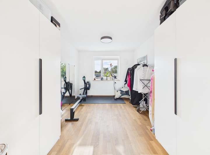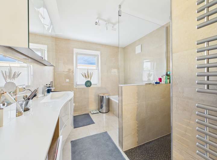 Neben dem Elternschlafzimmer mit ca. 18 m² stehen zwei Kinderzimmer sowie ein weiteres Arbeits- oder Gästezimmer zur Verfügung – ideal für Homeoffice oder Familienleben. Die separate Küche mit moderner Einbauküche und angrenzender Speisekammer ist über eine stilvolle Schiebetür erreichbar. Das hochwertig ausgestattete Bad mit Wanne, Regendusche, Einbaumöbeln und Fenster wird ergänzt durch ein separates Gäste-WC mit eigenem Waschmaschinenanschluss.