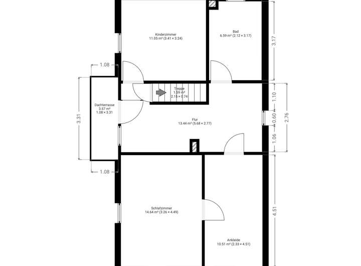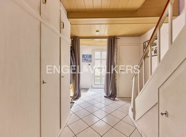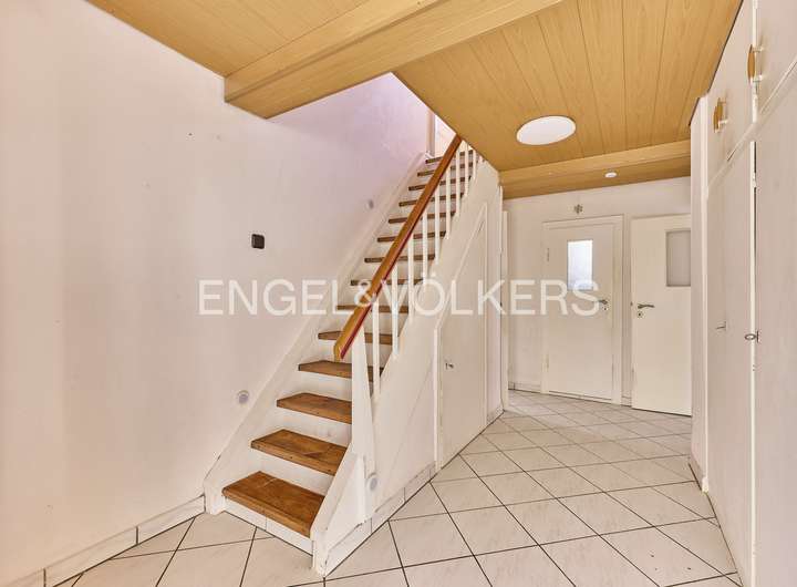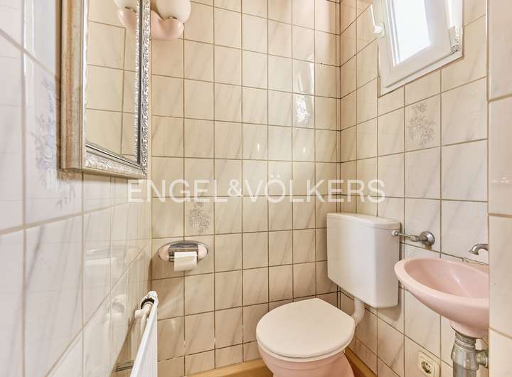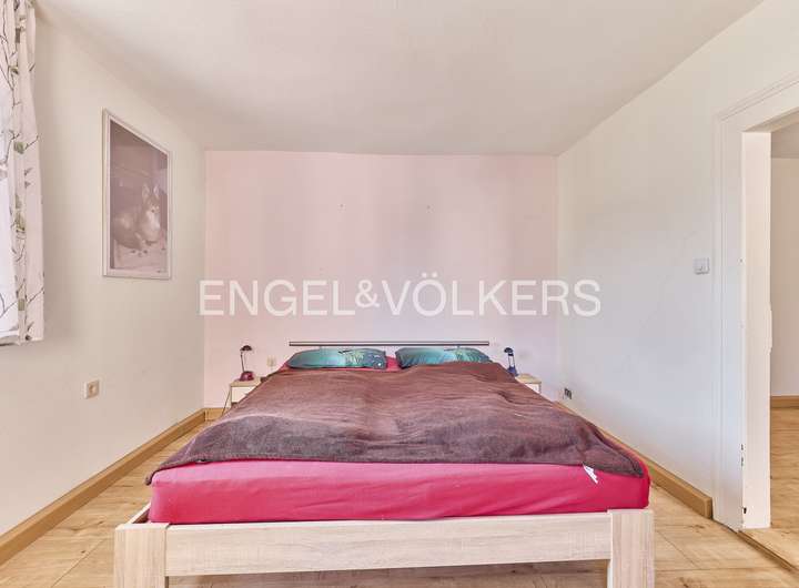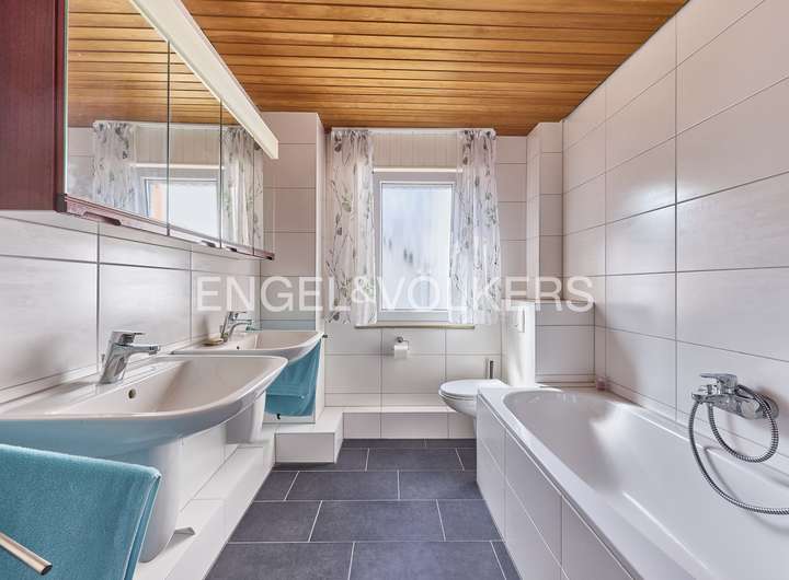 Über die Treppe im Flur gelangen Sie in das Obergeschoss. Dort befindet sich ein Schlafzimmer mit angrenzendem Durchgangszimmer, dass sich ideal als Ankleide- oder Arbeitszimmer eignet, sowie ein weiteres Zimmer zur individuellen Nutzung. Ebenso ein modernes Tageslichtbad, das 2014 umfassend saniert wurde. Mit Doppelwaschbecken, Dusche und Badewanne bietet es ausreichend Platz für die ganze Familie. Der Zugang zum Balkon auf dieser Etage ermöglicht entspannte Momente im Freien.