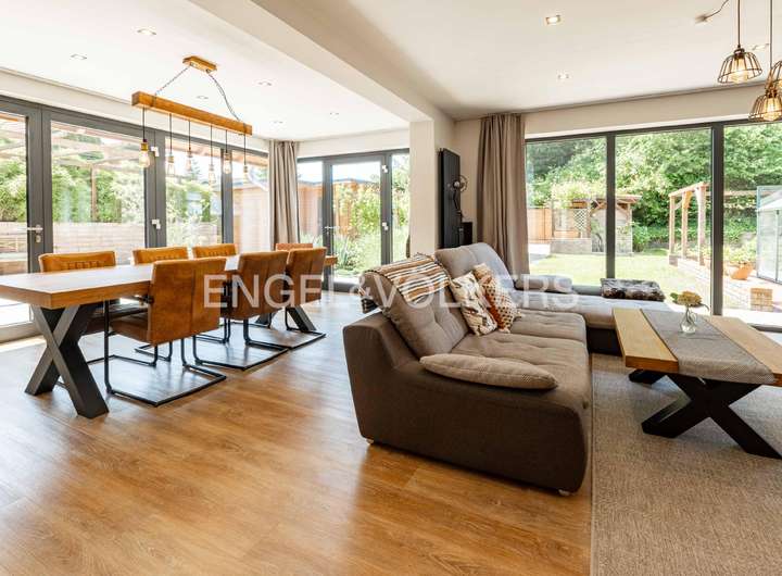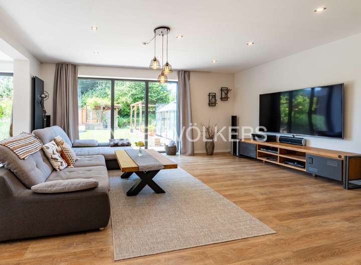 Das Herzstück des Hauses bildet der offen gestaltete Wohn- und Essbereich. Große Fensterfronten lassen viel Tageslicht herein, schaffen eine freundliche Wohnatmosphäre und öffnen den Blick in den liebevoll angelegten Garten. Die moderne Einbauküche ist harmonisch integriert und lädt zu gemeinsamen Kochmomenten.