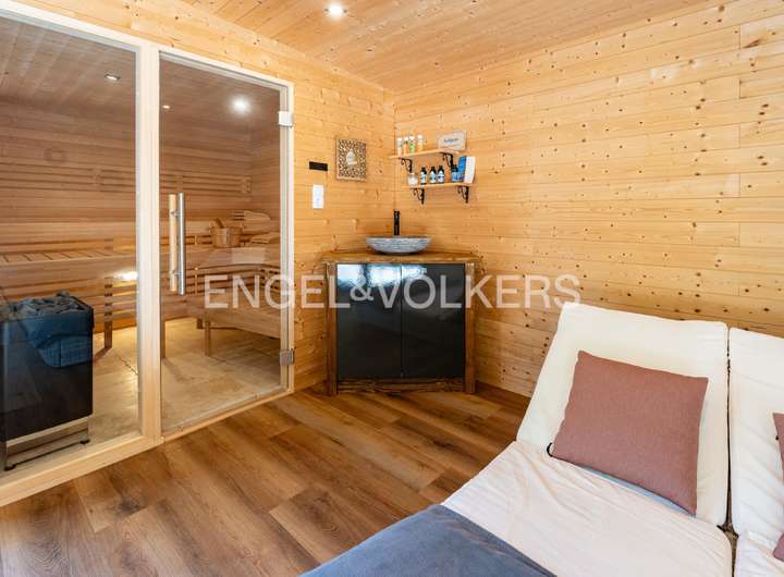 Der mediterran gestaltete Garten ist ein echtes Highlight und verspricht Urlaubsgefühle im eigenen Zuhause. Ob entspannte Stunden im Saunahaus, eine Erfrischung unter der Außendusche oder gesellige Abende am gemauerten Steinofen – hier ist für jeden Anlass der passende Rahmen geschaffen. Praktisch ist zudem der direkte Zugang von Garage und Carport in den Außenbereich.